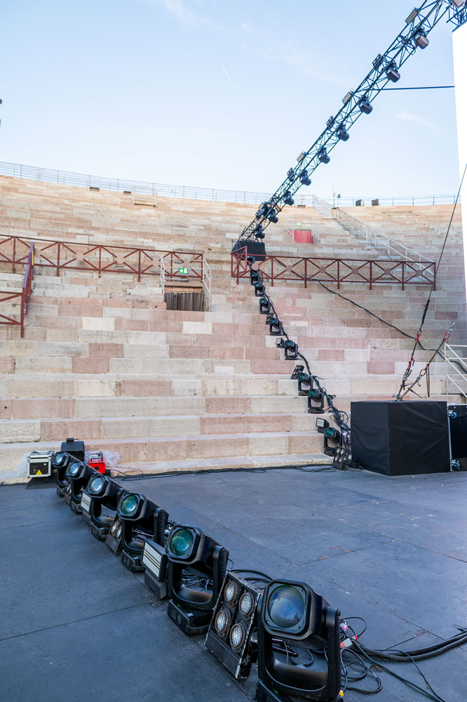 Questo disegno nasce quattro anni fa, con un allestimento di Vince Foster, che è il lighting designer che ha sempre seguito Zucchero, e che ha suggerito l’idea del sole e ha curato tutta l’immagine del palco. In seguito io ho preso in mano il tour, e ho modificato e adattato lo show in base alle esigenze e alle location, mantenendo però il sole e il concept che aveva dato Vince. Passando negli stadi, invece, ho dovuto modificare un bel po’: gli spazi e i palchi erano diversi; ma è rimasto il sole centrale, perché è stata una richiesta di Zucchero. Per la parte estiva ho arricchito molto la parte esterna del palco, volevo comunque la possibilità di allargare il più possibile la scena, viste le location con spazi più grandi. Quindi ho previsto delle truss messe in diagonale sui laterali equipaggiate con 76 Ayrton Cobra. In Arena ho riadattato di nuovo, perché gli spazi sono ancora diversi: ho mantenuto il disegno della cornice con i Cobra, usando sempre la cornice da 15 m che parte dal tetto e si va ad appoggiare sui gradoni dell’arena. Questo approccio lo abbiamo eseguito per la prima volta, ed è stato un po’ una scommessa; ovviamente abbiamo dovuto applicare la massima attenzione nei confronti del monumento storico. Ti assicuro che abbiamo fatto un ottimo lavoro e abbiamo eseguito i lavori con la massima cautela.