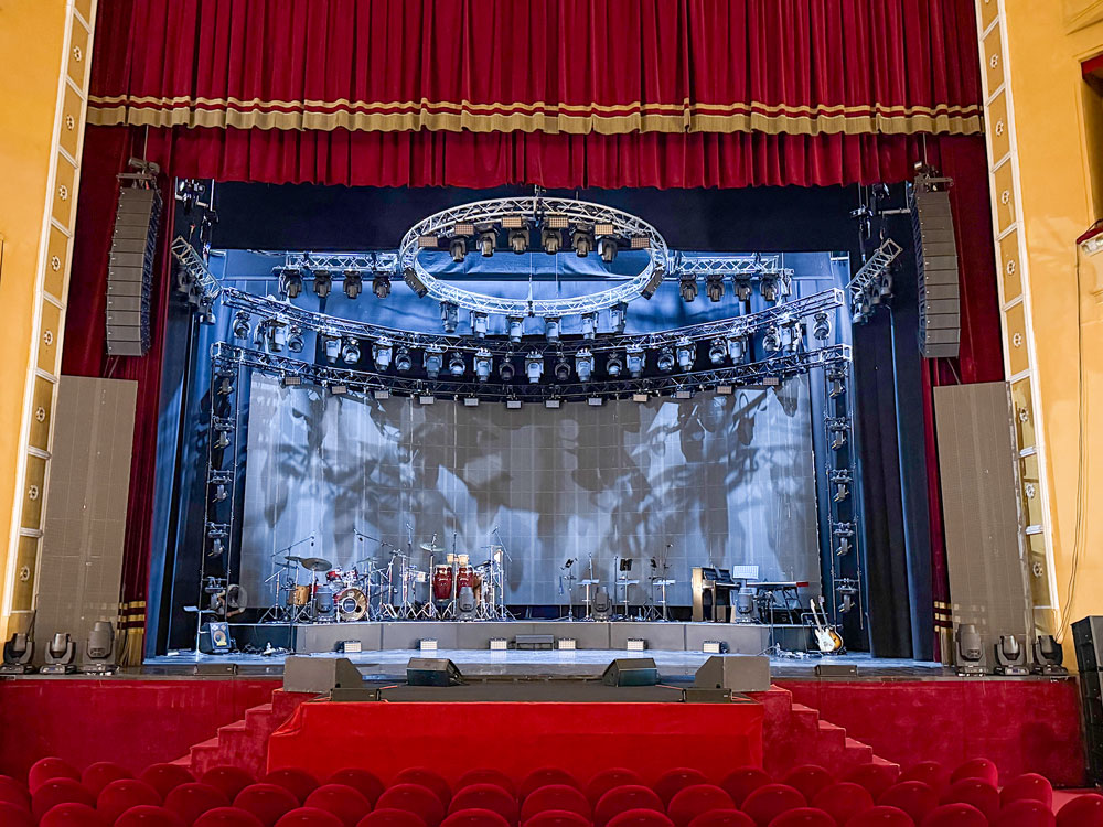 Per comprendere meglio la struttura tecnica dello show, abbiamo interpellato Davide Faraso, titolare di Top Service, che ha fornito l’intero setup di audio, luci, video e strutture. “Lo spettacolo è stato autoprodotto dallo stesso artista – ci racconta Faraso – ma prossimamente ripartirà sotto forma di tour nazionale, gestito da Vivo Concerti. Per questo allestimento al Teatro Augusteo abbiamo fornito tutta l’attrezzatura: audio, luci, video e strutture. La scenografia è stata disegnata da Francesco De Cave. Io sono stato coinvolto nella progettazione e ho curato tutte le programmazioni luci e video. Il risultato è stato molto bello, ma anche impegnativo.”