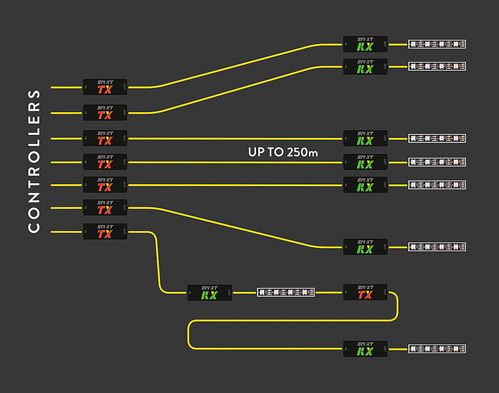 SPI-XT consente di estendere la trasmissione del segnale fino a 250 m, mantenendo la massima integrità del dato e garantendo prestazioni elevate anche in installazioni complesse, fisse o itineranti. Il sistema permette di centralizzare i controller in un’unica posizione, riducendo l’hardware distribuito e migliorando l’efficienza nella gestione e nel monitoraggio dell’impianto. Pensato per lavorare su grandi estensioni e in ambienti esterni, SPI-XT è certificato con grado di protezione IP57, assicurando affidabilità anche in presenza di intemperie e condizioni ambientali critiche. Questa caratteristica rende possibile l’impiego delle strip LED in contesti come illuminazione architetturale, installazioni decorative, eventi e club, mantenendo i controller al sicuro e riducendo l’esposizione dell’elettronica.
